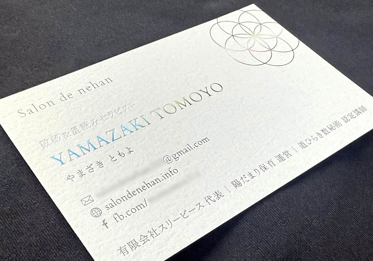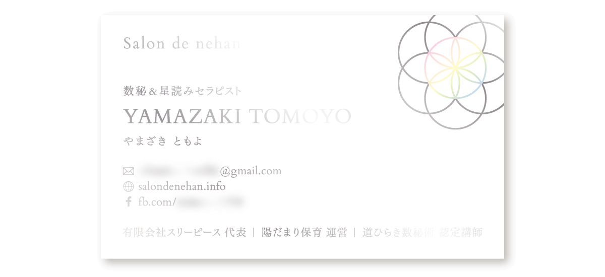 「有限会社スリーピース」代表、「陽だまり保育」運営、「道ひらき数秘術」認定講師など、幅広く活動されている数秘&星読みセラピスト「YAMAZAKI TOMOYO」様の名刺をデザインいたしました。