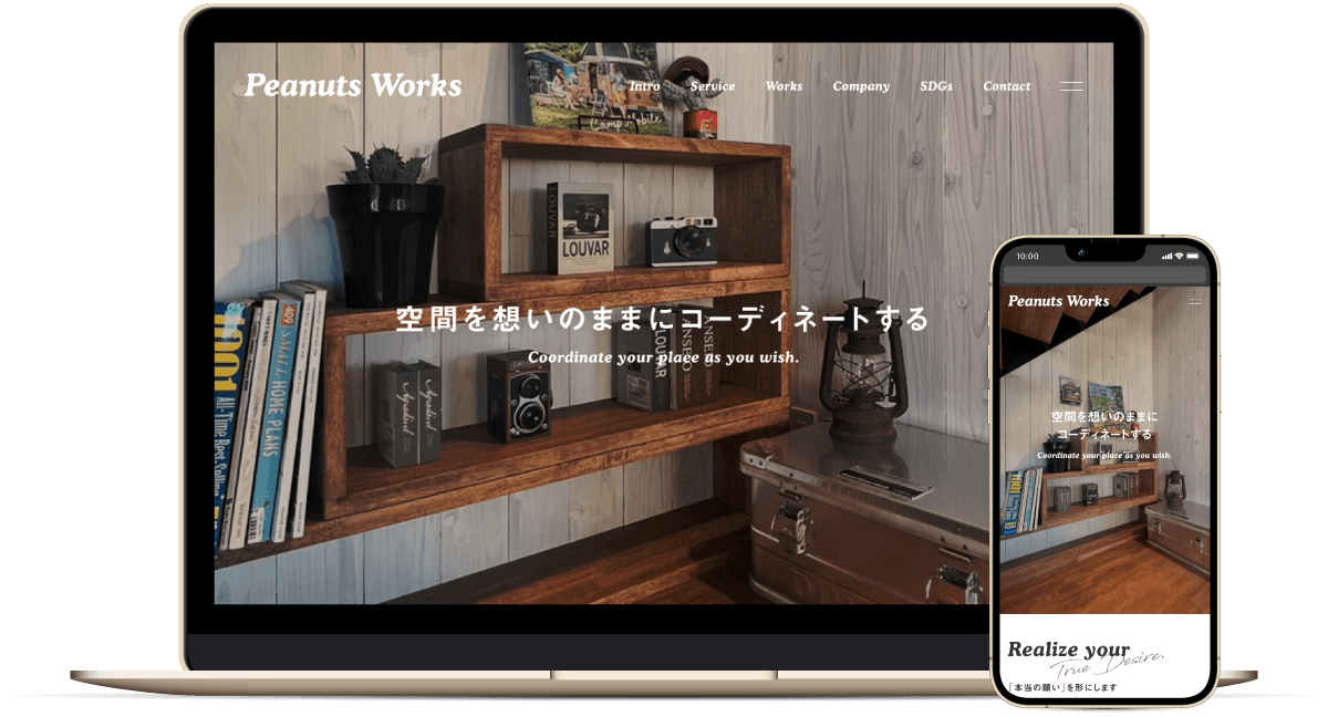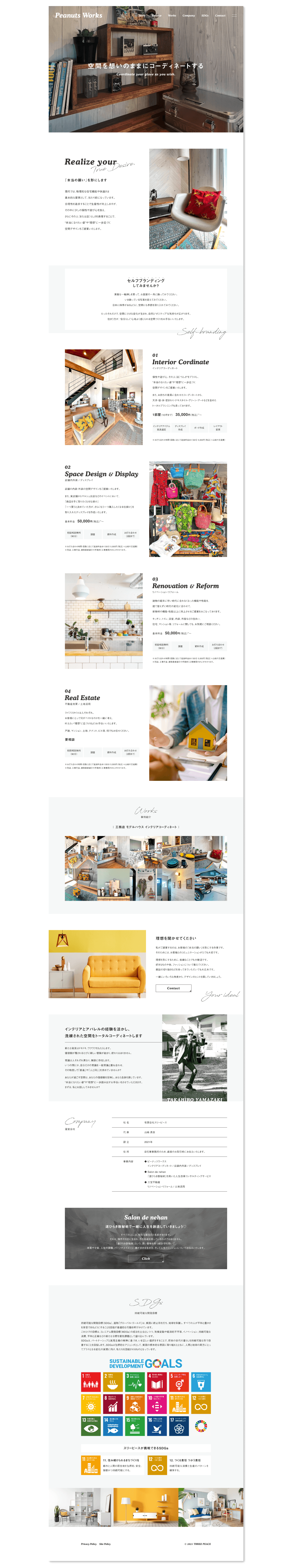 「お客様の『本当の願い』を形に」という想いのもと、インテリアコーディネート、店舗内外装、ディスプレイ、リノベーション・リフォーム、土地活用、不動産売買など幅広く手がけている「Peanuts Works」様のシングルページWebサイトを制作いたしました。